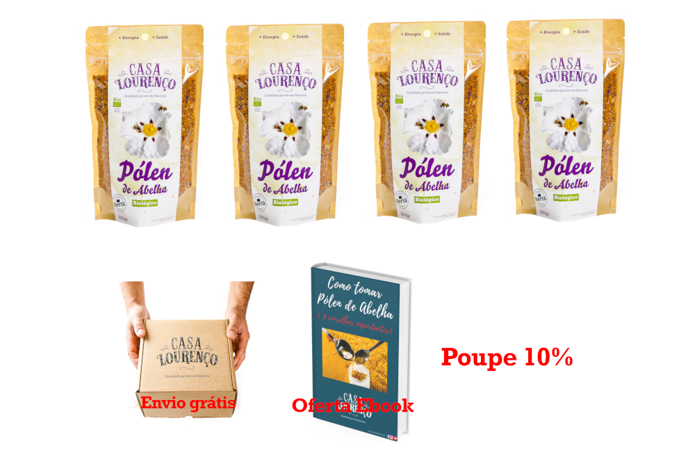 Na compra do Pack de quatro embalagens recebe inteiramente grátis: - O nosso Ebook: “Como tomar Pólen de Abelha (8 conselhos importantes)" - Portes de envio E ainda: - Poupa 10% (sobre a compra individual)